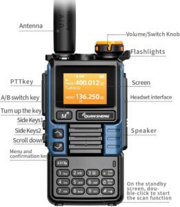 Transmit authorization in stock configuration varies by regulatory region. US units are typically locked to 144–148 MHz on VHF and 420–450 MHz on UHF. European CE-marked units narrow further to 144–146 MHz and 430–440 MHz. General market units cover 136–174 MHz and 350–470 MHz. Custom firmware can unlock wider TX ranges, but that is a separate legal conversation addressed later in this guide.